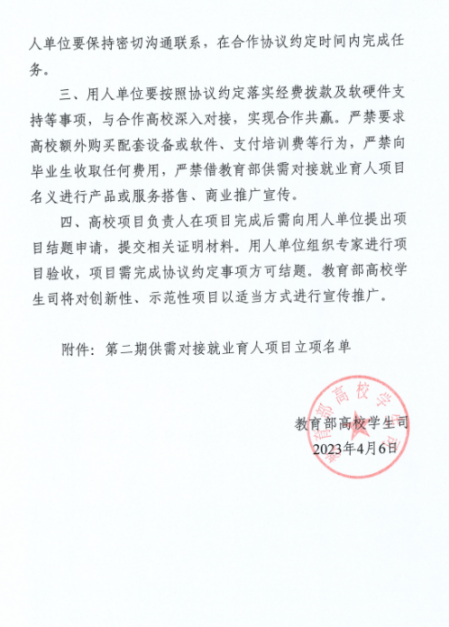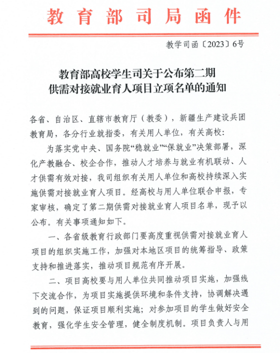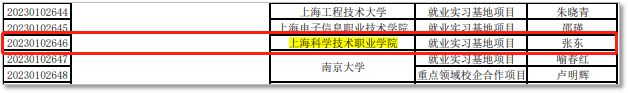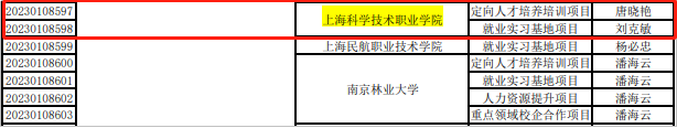 2023年4月6日,教育部高校学生司发布《关于公布第二期供需对接就业育人项目立项名单的通知》(教学司函〔2023〕6号),上海科学技术职业学院申报1个定向人才培养培训项目,2个就业实习基地项目,全部成功立项。