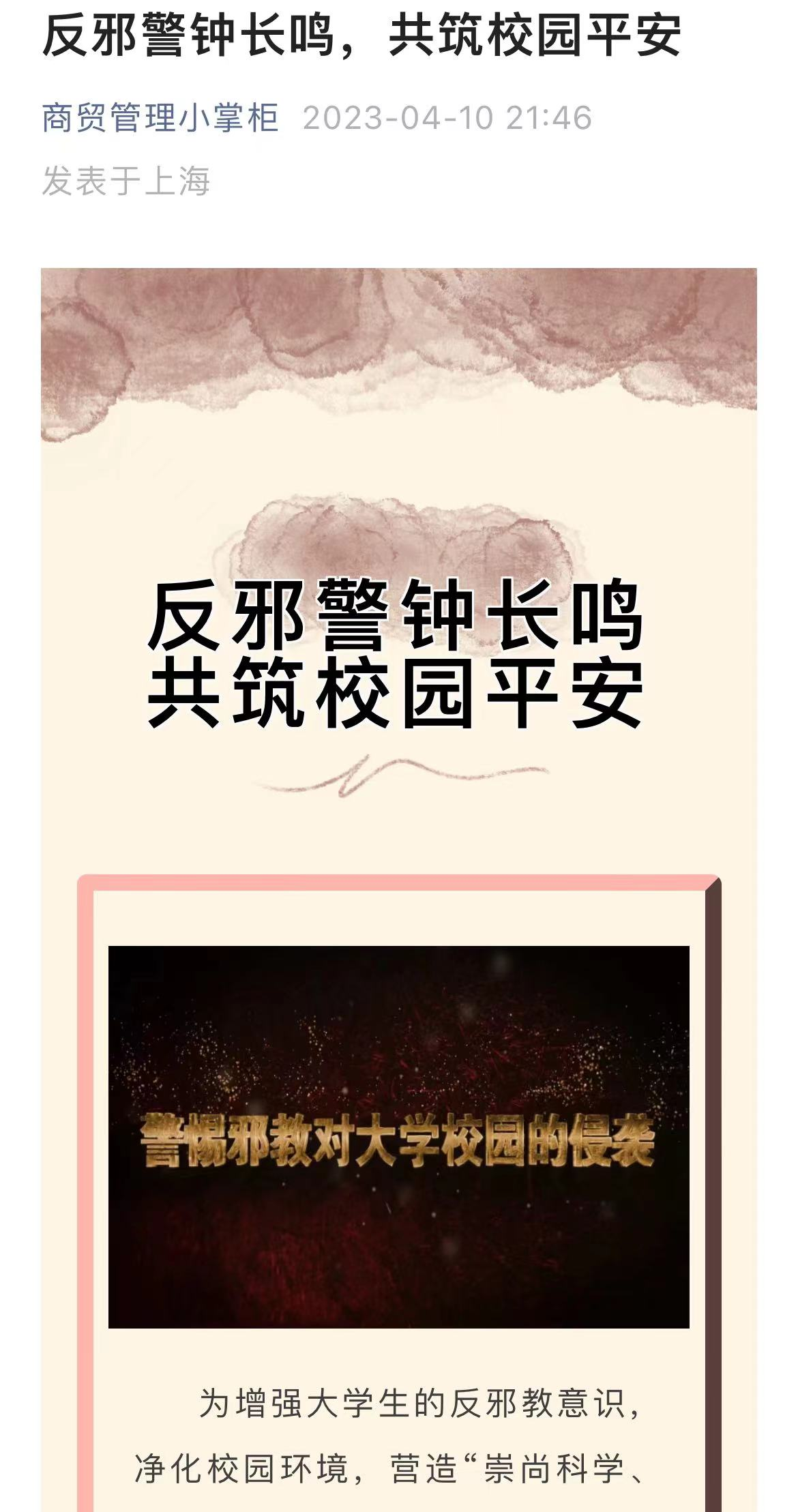 商贸管理学院2021级的晏婉琪同学表示:我们大学生正处于成长的阶段,或许对一些社会糟粕认知较浅,邪教便将手伸向大学生们,利用大学生的好奇心等特点对其加以精神毒害和精神控制,因此一些大学生便不慎陷入其中,使他们的身心健康和成长造成难以挽回的损害,浅则丧失理智,重则丧失生命。所以我们要做一名有正义感和责任心的大学生,更要“崇尚科学,反对邪教”。只要我们全社会都齐心协力,共建文明,邪教就再也没有立足之地!