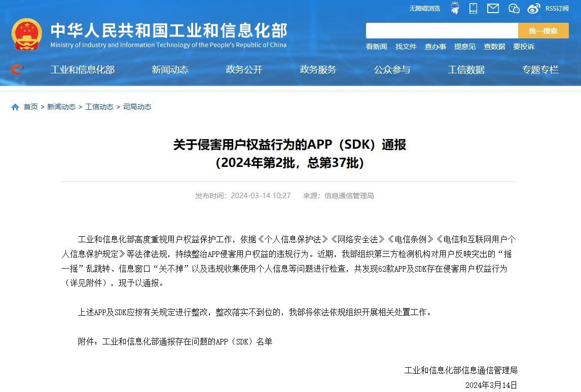 3月14日,工信部信息通信管理局发布《关于侵害用户权益行为的APP(SDK)通报》(2024年第2批,总第37批),对怪兽充电、途虎养车等62款存在侵害用户权益行为的APP及SDK进行了通报。