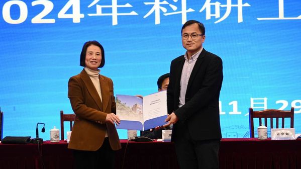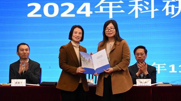 许金如宣读2024年学校科研工作先进集体、科研工作先进个人名单。科研工作先进集体代表杨春雷老师、科研工作先进个人王依娜老师代表获奖老师作交流发言。