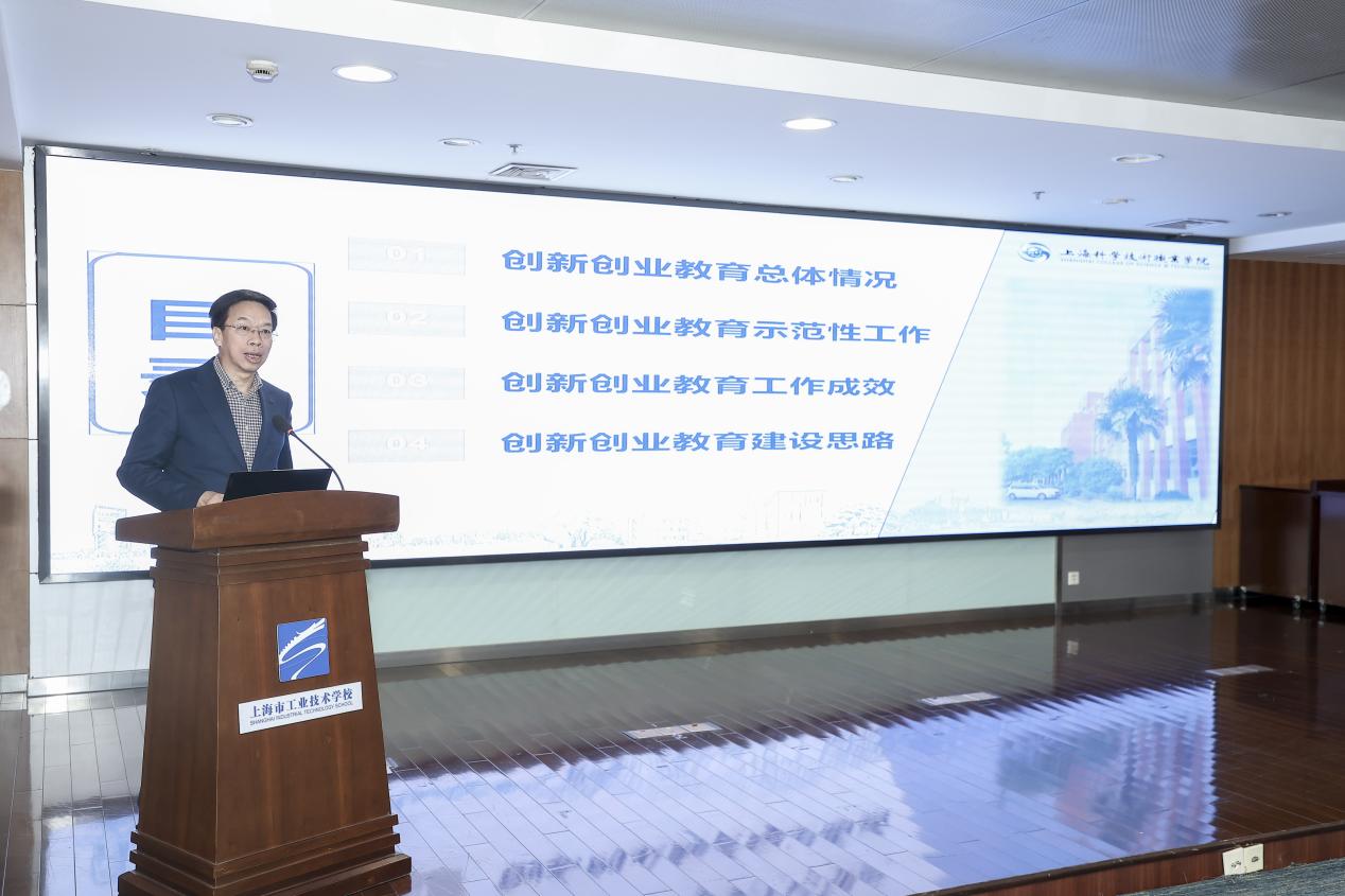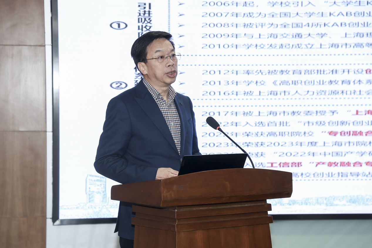 学校党委书记周胜在大会上作交流发言。他首先代表学校向与会的各位领导、同仁对上海科学技术职业学院创新创业教育工作的支持和帮助表示衷心的感谢。就学校创新创业教育建设思路,他指出,一是明确创新创业学院建设定位。我校将继续以“市级创新创业教育实践基地”、“创业指导站”建设为契机,结合学校办学定位和特点,不断创新人才培养机制,通过教育教学改革和实践,更好地为新质生产力的发展提供人才支持和创新动力,推动科技成果转化和区域经济社会的高质量发展;二是落实创新创业教育建设内容。包括完善和推广专创融合培养模式,完善学生创新创业支撑体系,充实和更新创新创业教学资源库,增强服务创新驱动发展的能力;三是开展高质量创新创业教育活动。围绕学校创新创业课程建设、创新创业大赛、创新创业服务等,开展针对性、分层次的高质量、权威性会议、培训班、训练营等活动,为上海职业教育发展舔砖加瓦;四是优化“校赛-市赛-国赛”三级竞赛体系。深化创新创业大赛对人才培养改革的引领作用,形成“校赛、市赛、国赛”三级竞赛体系,校赛“搭平台”、市赛“选种子”、国赛“有突破”,争取2025 年国赛金奖有突破。