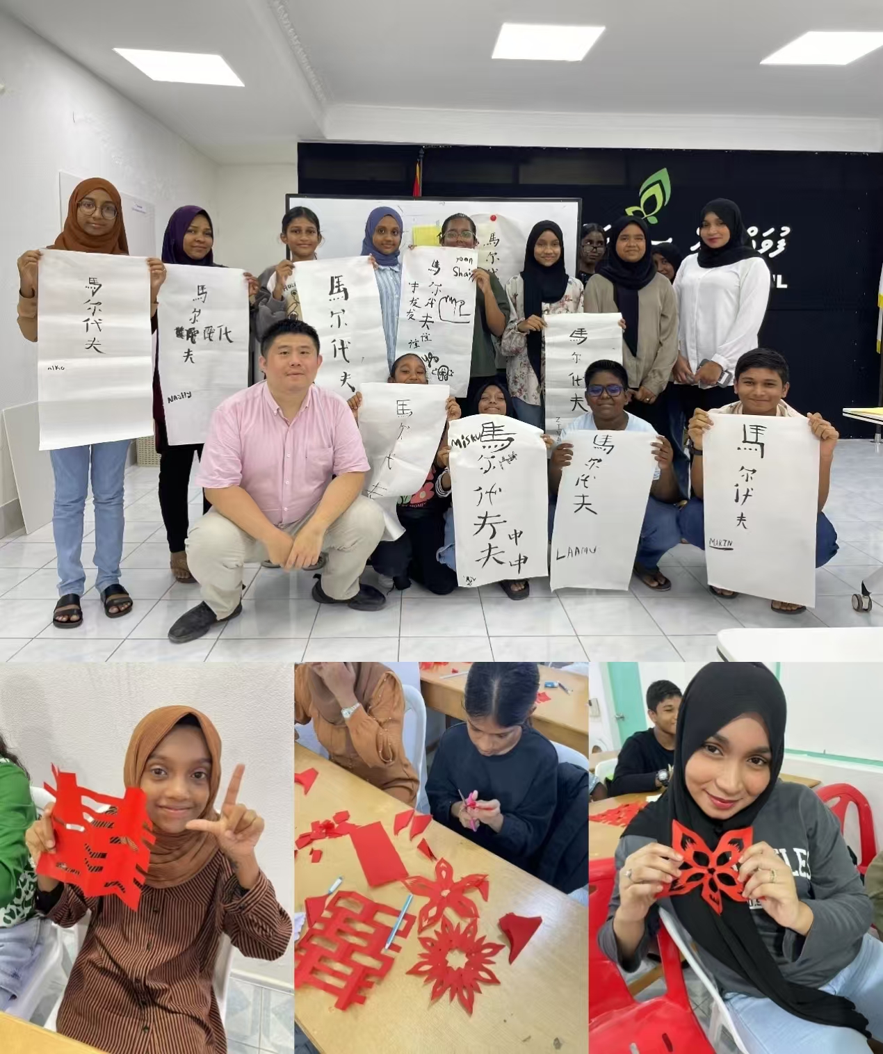 中国文化体验课程涵盖中国传统艺术剪纸、书法与音乐。学员们在老师的带领下,亲手剪出“福”字、熊猫等图案,临摹“马尔代夫”、“友谊”等汉字,学会《送别》、《两只老虎》等中国经典曲目,在不同的项目中体会了中国传统文化的韵味。