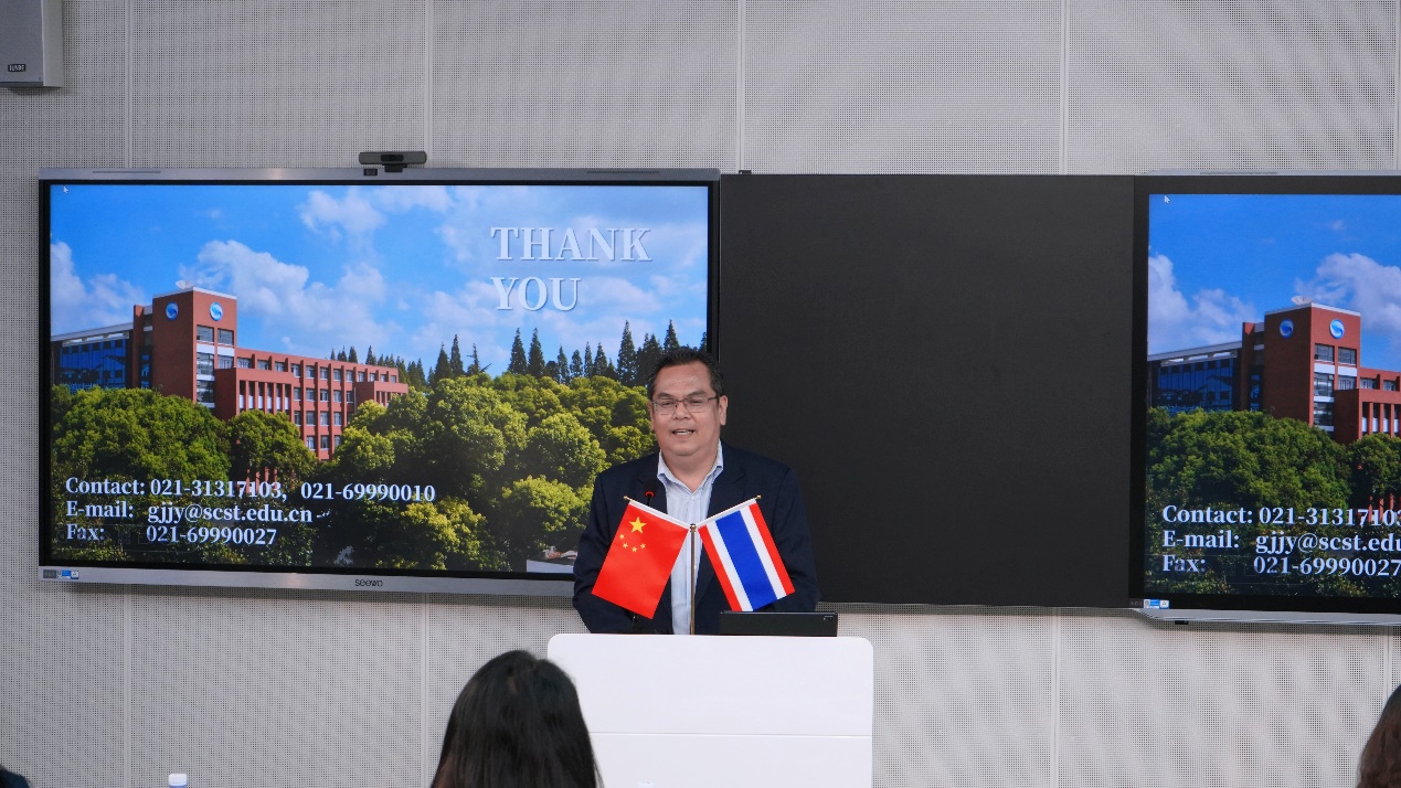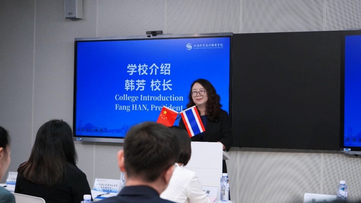 韩芳致欢迎词并详细介绍了学校的办学理念、专业特色及近年来在产教融合方面取得的成果。她表示,上海科学技术职业学院始终致力于培养高素质技术技能人才,希望通过此次交流,与泰国教育部及各级教育机构建立长期合作关系,共同推动职业教育的国际化发展。
