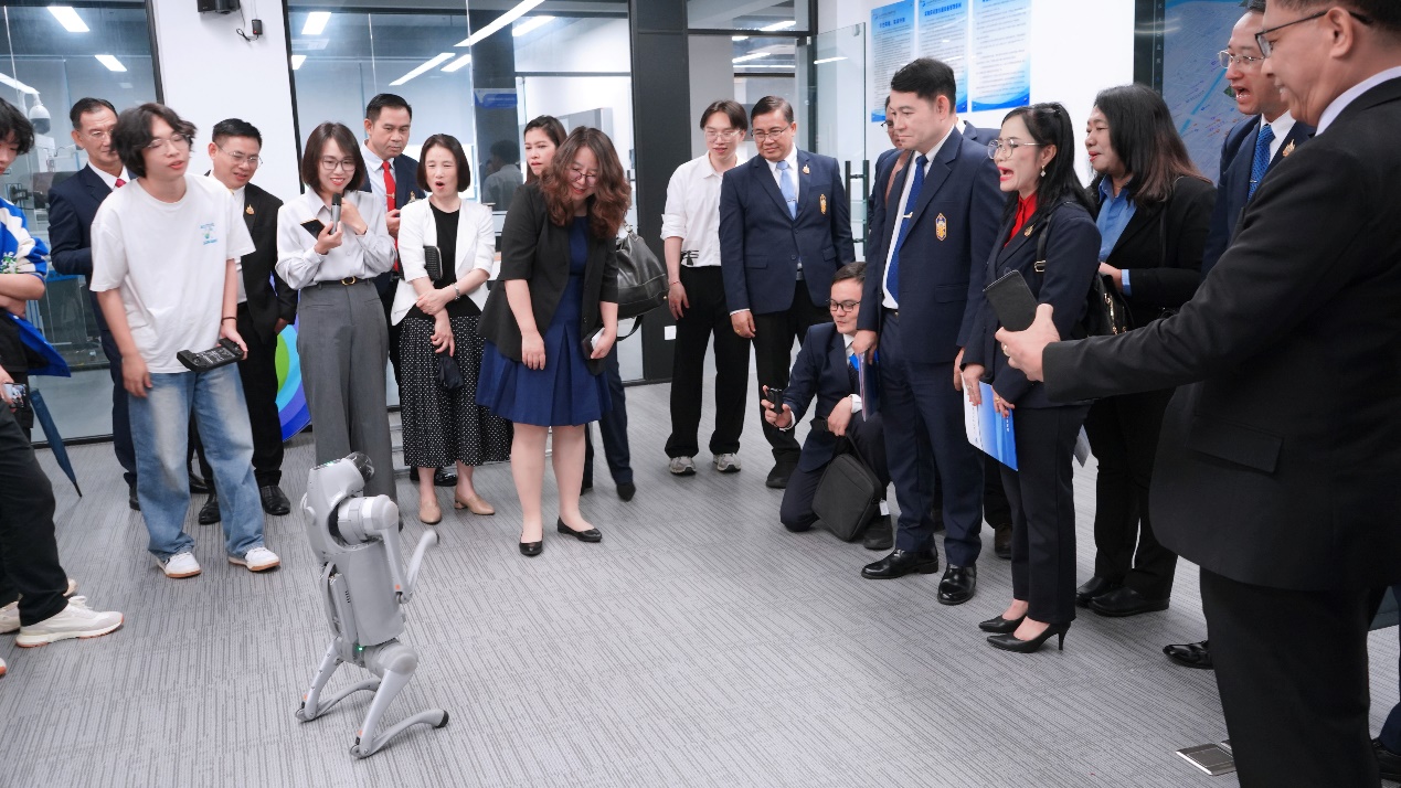 欢迎仪式结束后,代表团在校领导的陪同下参观了学校产教融合实践中心。参观过程中,代表团对学校先进的实训设备、校企合作模式及技术应用成果表现出浓厚兴趣,并与现场师生进行了互动交流。在智能安防实训中心,代表团成员兴致勃勃地与智能机器狗进行互动,尝试语音指令控制,当机器狗准确完成问候、舞蹈等动作时,现场响起阵阵掌声。