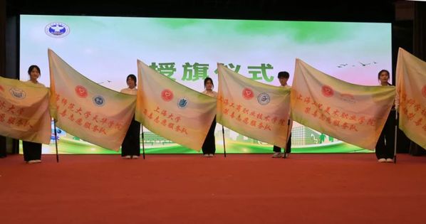 在“嘉定区高校禁毒志愿服务队”授旗仪式上,来自同济大学、上海科学技术职业学院等6所高校的志愿者代表接过旗帜。