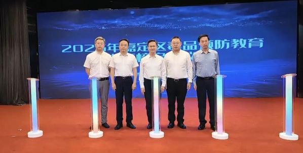 周国庆、卞唯敏、徐嵘、周胜、乔坚共同启动“2025年嘉定区毒品预防教育进高校”活动。