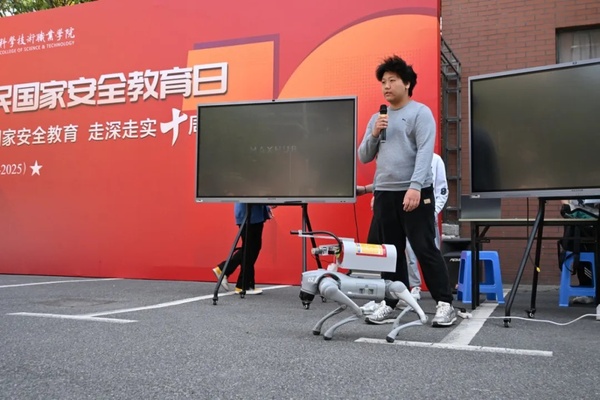 活动现场亮点纷呈。来自马克思主义学院的“中国共产党人精神谱系”大学生宣讲朗诵团带来了《国安如磐,青春护旗》的主题宣讲朗诵。他们用青春的声音传递对国家安全最真挚的情感和最坚定的决心,展现了青年学子对国家安全的深刻理解和使命担当;通信与电子工程学院专业社团学生带来了网络安全风险展示,通过生动的案例,让师生们更加直观地认识到网络安全的重要性,学会如何防范网络风险,保护个人信息安全。在无人机和地面机器人安防巡检展示中,展现了人工智能+安防背景下,高科技设备在安防领域的创新应用,让师生们见证了科技如何为国家安全保驾护航。