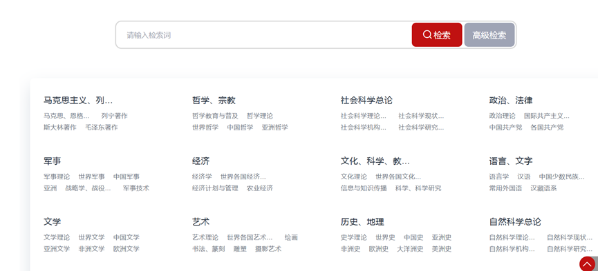 Step2: 下滑页面至下图所示,可以使用网页上方搜索框进行关键词搜索,或者点击下方专业大类进行文献浏览。