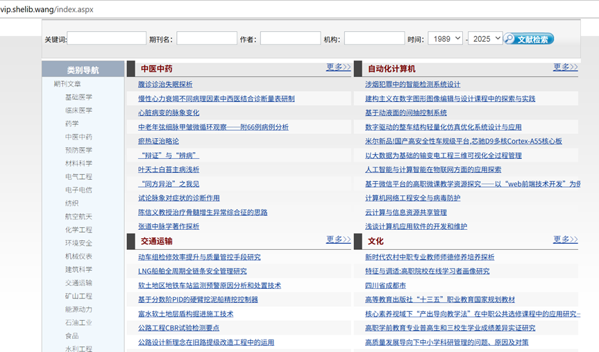 Step1:连接校园网后,点击上方网址进入使用页面,点击网页最上方搜索框进行关键词、期刊名、作者、机构或者时间节点的高级搜索,或者点击左侧类别导航进行专业大类的文献集中浏览。