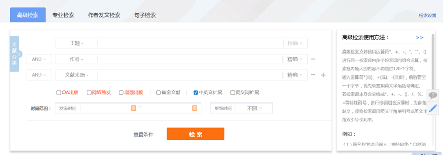 在数据库页面找到“高级检索”功能,可以限定年份,选择核心期刊,筛选文献类型等等。