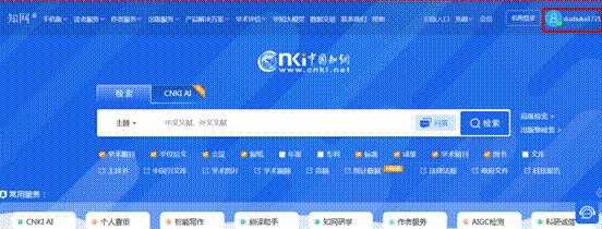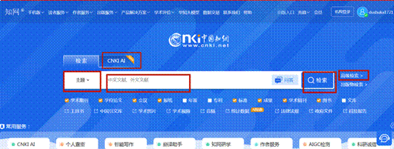 Step2:登录后的页面如下图所示,可使用搜索框左侧下拉框进行搜索类别的勾选(如主题、篇关摘、关键词、作者等),然后在右侧填写关键词进行搜索,或者使用CNKI AI进行提问搜索。