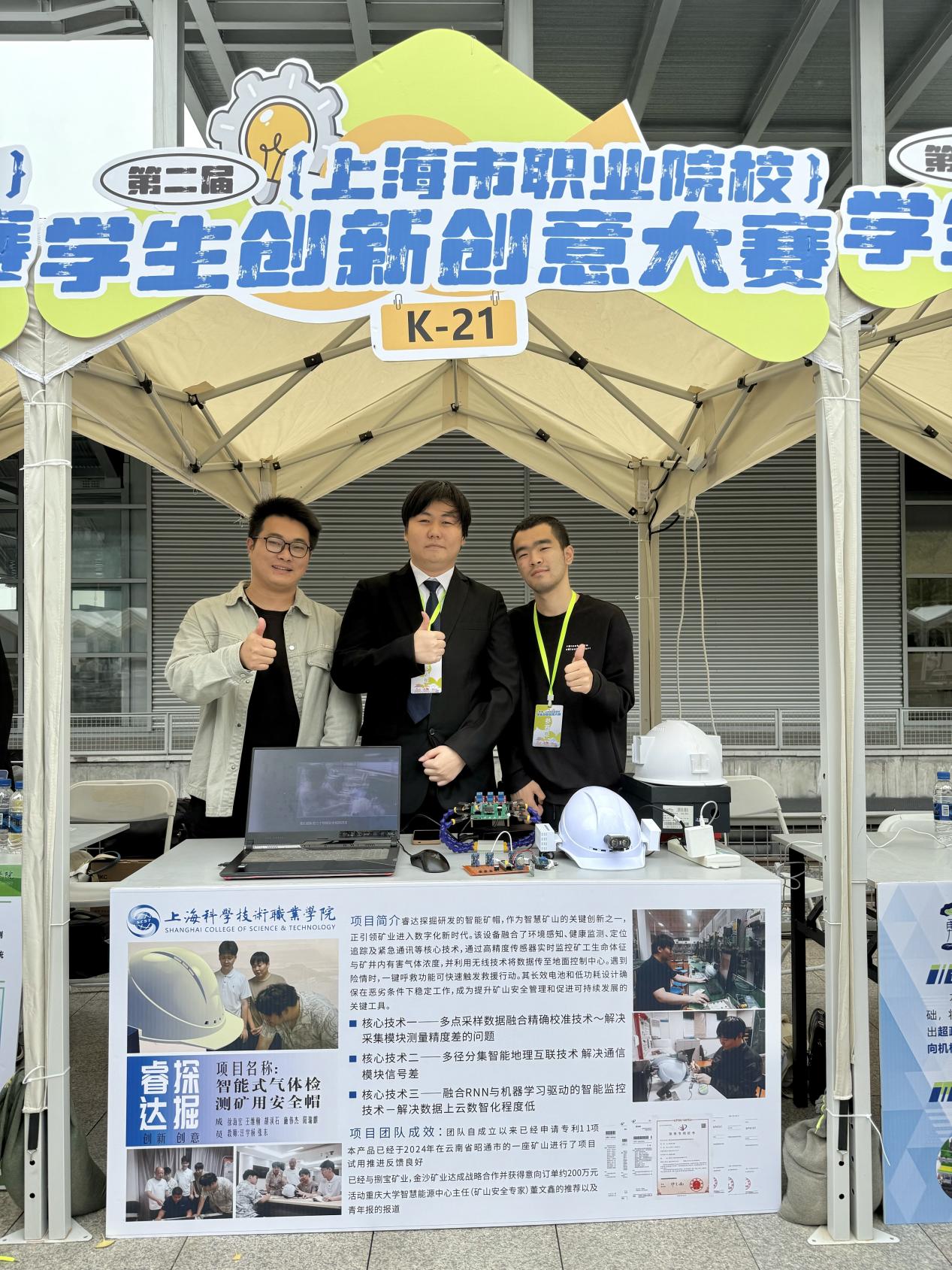 此次大赛在徐汇西岸江畔顺利举行,共设科技创新组和文化创意组两大组别,涵盖智能制造、信息技术、文化创意等多个领域,期间,各项目团队现场通过作品介绍、实物展示、互动问答等与评委进行深入的交流,评委根据设计思路、特色亮点、应用前景等情况现场综合打分。经过激烈角逐,我校《超慧割-果国全自动割草机无行者》、《智能式气体检测矿用安全幅》项目获科技创新组金奖,《原色本态》、《<手机-我们>--创意产品设计组合》项目获文化创意组金奖。