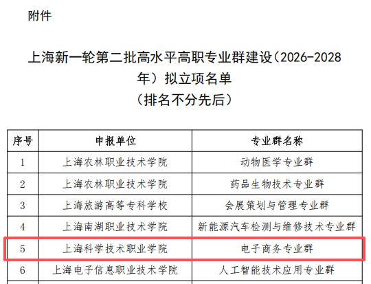 近日,上海市教育委员会职业教育处公示了新一轮第二批高水平高职专业群建设(2026—2028年)拟立项名单,我校电子商务专业群成功入选,这是该专业群继2022年入选上海高水平高职专业群建设(2022-2025年)后再次获此殊荣。