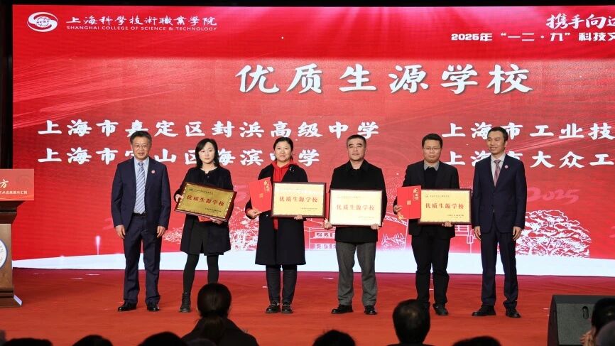 上海市宝山区海滨中学副校长陈玉华、上海市大众工业学校工会主席徐剑、上海市嘉定区封浜高级中学教导处主任王慧慧、上海市工业技术学校招生就业办副主任汪应斐登台,学校党委委员、副院长杨益明、曾喜平上台赠感谢信及优质生源学校牌。