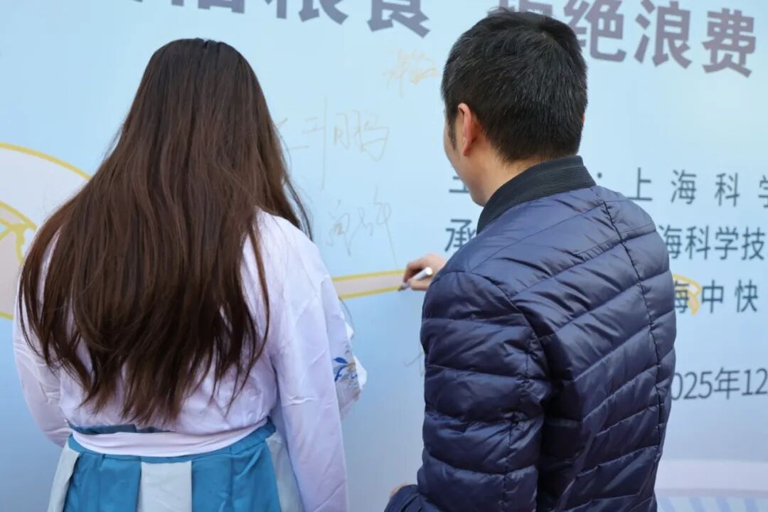 校领导率先在爱粮背景板上签名,学生代表紧随其后,一个个签名不仅是一份承诺,更是一份行动宣言,彰显了大家珍惜粮食、反对浪费的决心。