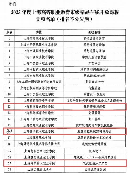 近日,上海市教育委员会发布了《上海市教育委员会关于公布2025年度上海高等职业教育市级精品在线开放课程立项名单的通知》(沪教委职〔2025〕29号),我校《社群营销与运营》《底盘线控系统装调与测试》《现代数控加工工艺》3门课程成功立项。